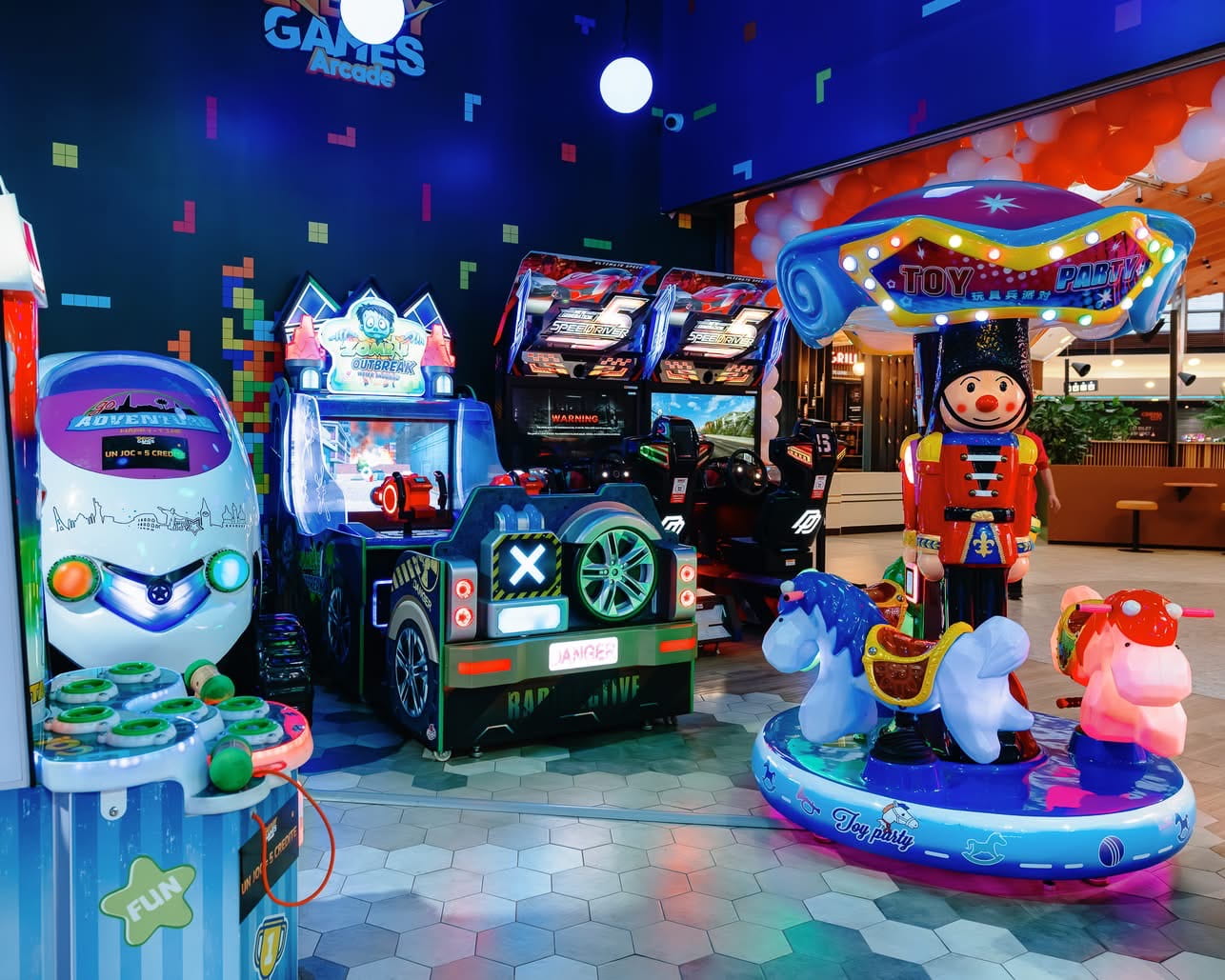 Zona de jocuri arcade este locul unde adrenalina și buna dispoziție se întâlnesc. Copiii își pot testa reflexele, curajul și spiritul de competiție prin jocuri de îndemânare, simulatoare interactive și curse pline de acțiune, fiecare rundă fiind o nouă aventură.